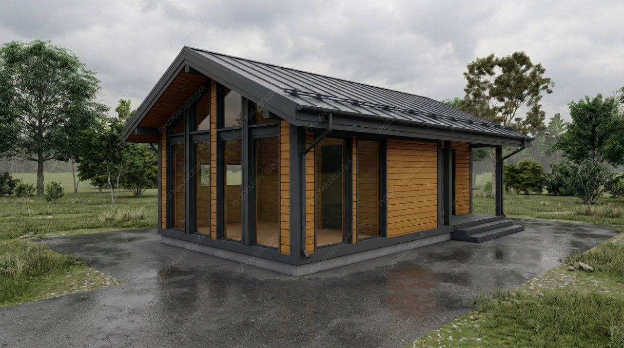 Баня «Кленовая» размером 9х5 метров с двухскатной крышей предлагает продуманную планировку общей площадью 39,59 кв.м. Центральным элементом архитектуры выступает панорамное остекление в зоне отдыха, наполняющее интерьер естественным светом и обеспечивающее визуальную связь с окружающим ландшафтом. Двухскатная кровля придает строению классический, завершенный облик и надежно защищает от атмосферных осадков.