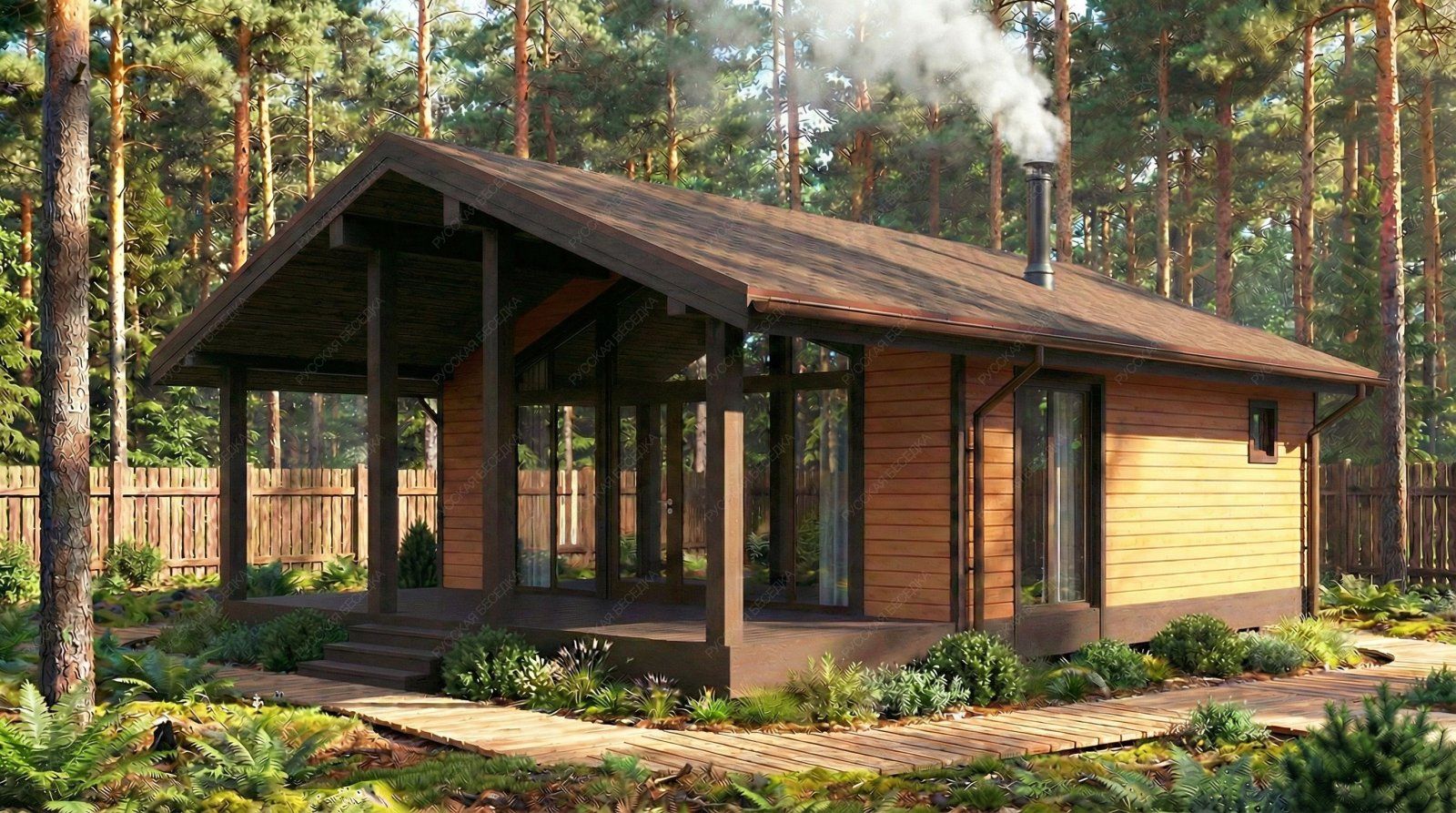 Каркасная баня «Олана» с двухскатной крышей представляет собой масштабный проект площадью 72 кв.м. при габаритах 10,1х7,15 метра. Планировка ориентирована на комфортный отдых большой компанией и включает все функциональные зоны: просторную парную 7,00 кв.м., отдельные санузел и помывочную, а также кухню-гостиную 25,78 кв.м. Ее ключевой особенностью является панорамное остекление, интегрированное в зону гостиной. Это создает эффект единения интерьера с природным окружением, наполняя пространство светом. Значительная площадь отведена под открытую террасу 19,95 кв.м., являющуюся логическим продолжением гостиной для отдыха на свежем воздухе. Двухскатная крыша обеспечивает классический, солидный облик и надежность конструкции. Каркасная технология позволяет реализовать такой проект с оптимальными сроками возведения и высокими показателями энергоэффективности. Данная модель предназначена для создания полноценного гостевого или семейного комплекса, где традиционные банные процедуры гармонично сочетаются с возможностями для гостеприимства и продолжительной релаксации в едином, визуально открытом пространстве.