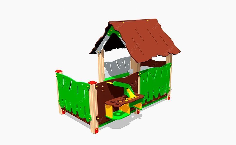 Детский игровой домик «Хижина с кухней» представляет собой домик на стойках из клееного бруса и дополнительный модуль в виде маленькой кухни. На кухне дети могут устраивать игры с песком, развивая мелкую моторику рук. Домик оснащен столиком и двумя скамейками. Кухня представляет собой отдельный игровой модуль. Данное оборудование предназначено для эксплуатации на детских площадках.