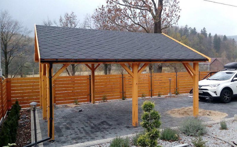 Навес из дерева послужит отличным парковочным местом для одного или нескольких автомобилей.