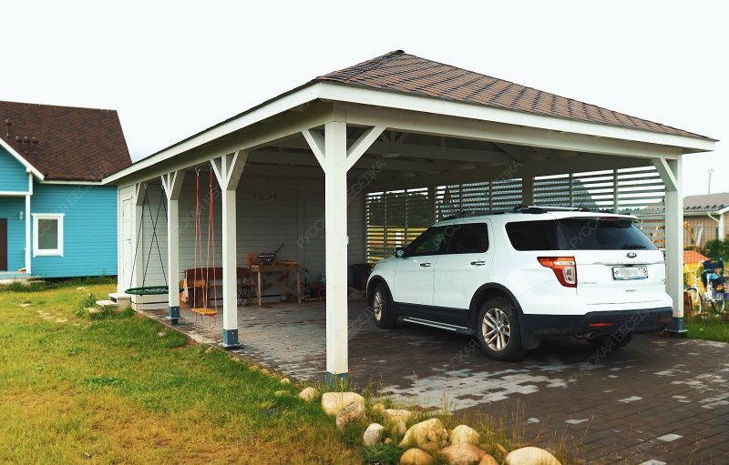 Навес из дерева послужит отличным парковочным местом для одного или нескольких автомобилей.