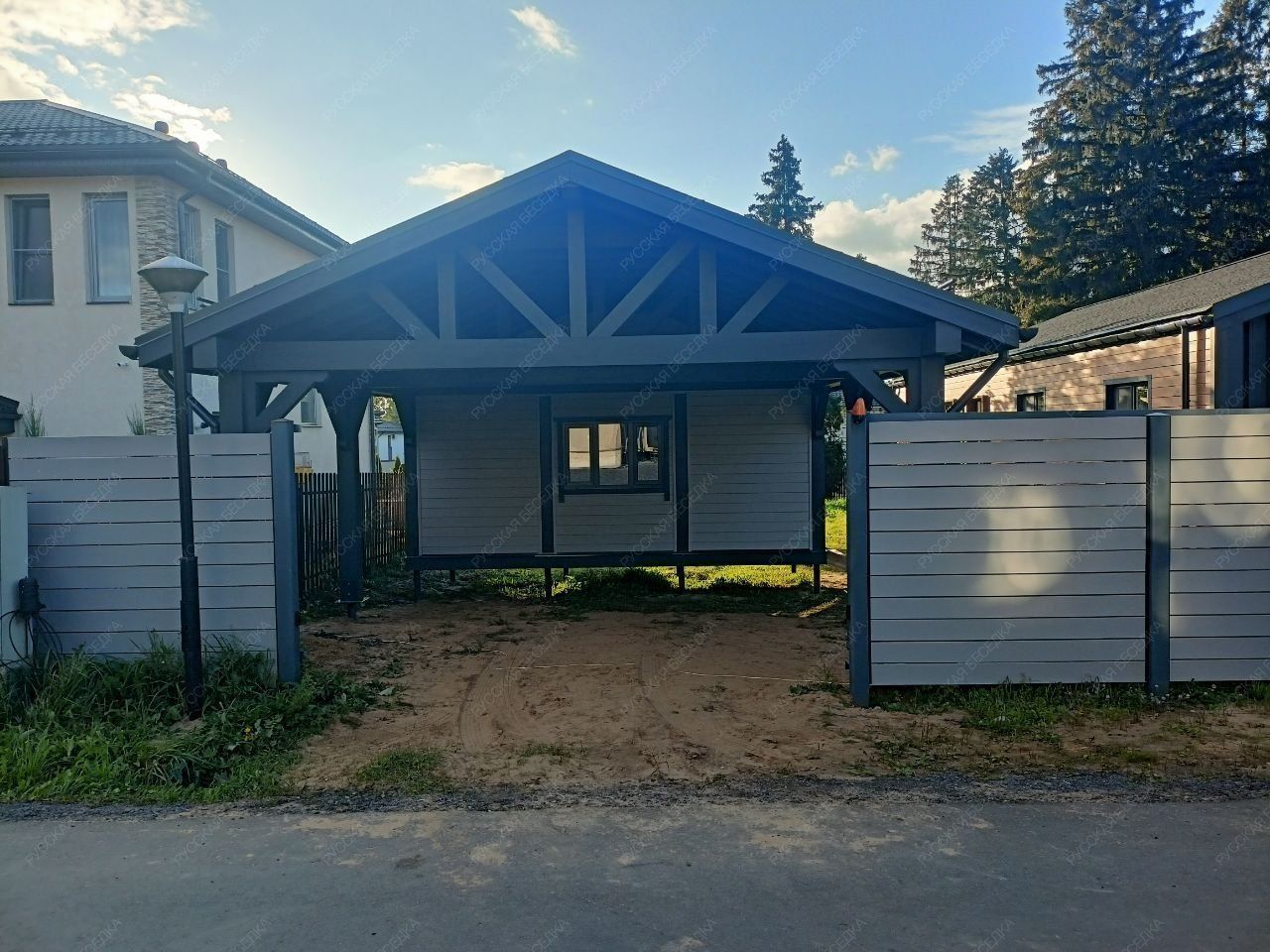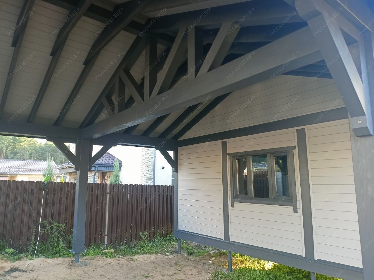 Для производства всех элементов навеса используется только отборная древесина без малейших дефектов, прошедшая камерную сушку и пропитку антисептиками. Навесу после защитной обработки лаком не страшны высокая влажность, а значит, можно быть уверенным, что дерево не растрескается, не разбухнет и не покоробится.