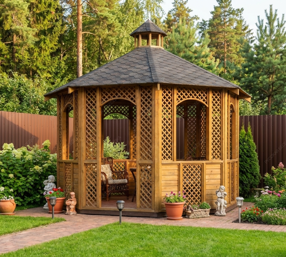 Современный ландшафтный дизайн и беседки - центральные элементы загородного участка. Беседка должна размещаться в таком месте участка, где вам будет комфортно находиться, а также она должна отвечать своему назначению и притягивать взгляды. Беседка является уникальным строением, с ее помощью можно отдохнуть за чашечкой кофе, укрыться от знойного солнца или провести шумный праздник в кругу семьи и друзей.