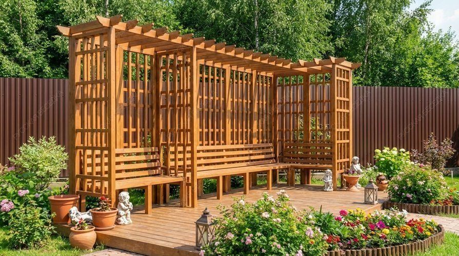 Деревянная пергола придаст вашему садовому участку теплую и уютную атмосферу.Также пергола может служить опорой для плетущихся растений - только представьте, как приятно находиться в окружении цветущего клематиса или пышных роз! Дополнительные элементы, такие как встроенное освещение, декоративные решетки, качели или скамейки, могут усилить визуальный эффект и создать еще более комфортное пространство. А если в конструкцию перголы добавить подиум, то он может служить местом для расслабления или стать сценой для семейных мероприятий.
