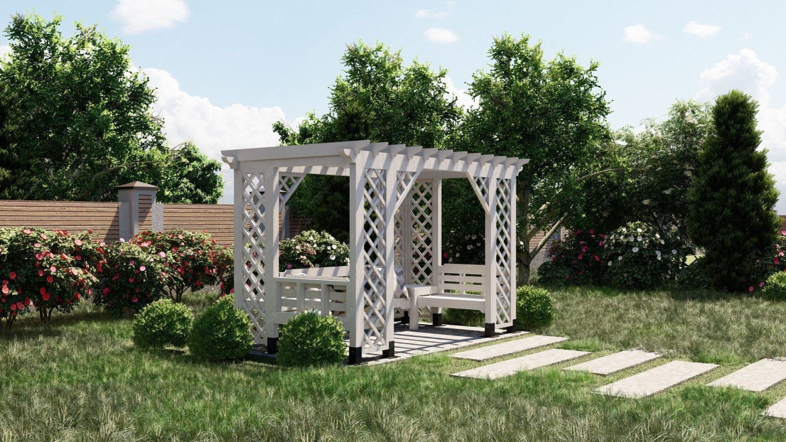 Деревянная пергола придаст вашему садовому участку теплую и уютную атмосферу.Также пергола может служить опорой для плетущихся растений - только представьте, как приятно находиться в окружении цветущего клематиса или пышных роз! Дополнительные элементы, такие как встроенное освещение, декоративные решетки, качели или скамейки, могут усилить визуальный эффект и создать еще более комфортное пространство. А если в конструкцию перголы добавить подиум, то он может служить местом для расслабления или стать сценой для семейных мероприятий.