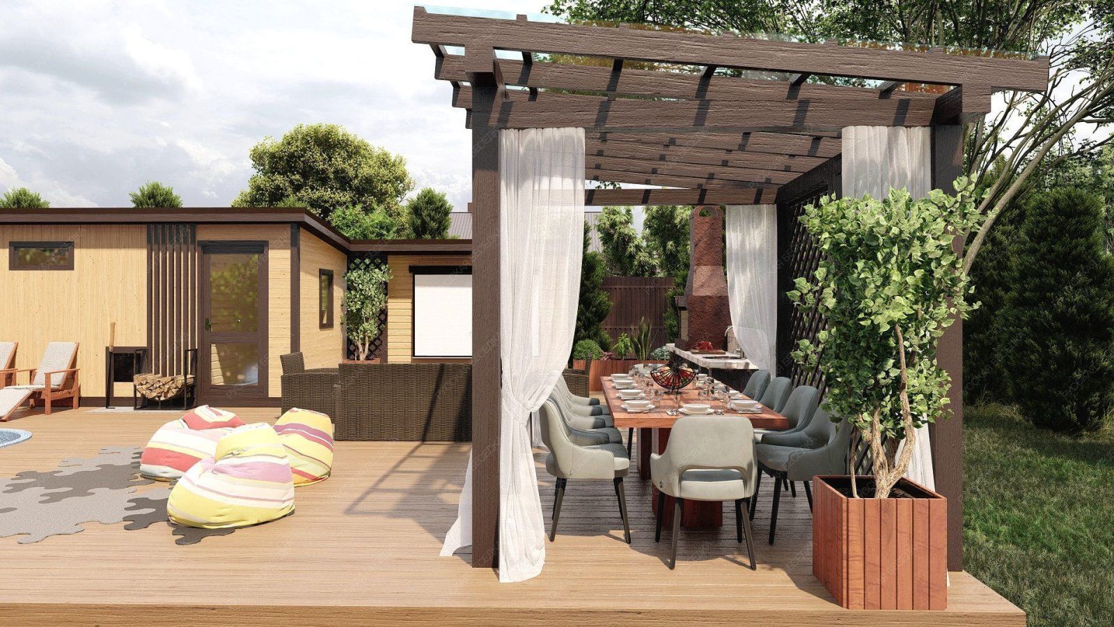 Отличительной особенностью зон отдыха является их многофункциональность: вы можете готовить на просторной веранде, организовать обеденную зону под навесом или в закрытой части, расположить летний кинотеатр под открытым небом, интегрировать в конструктив террасы бассейн или детскую площадку.