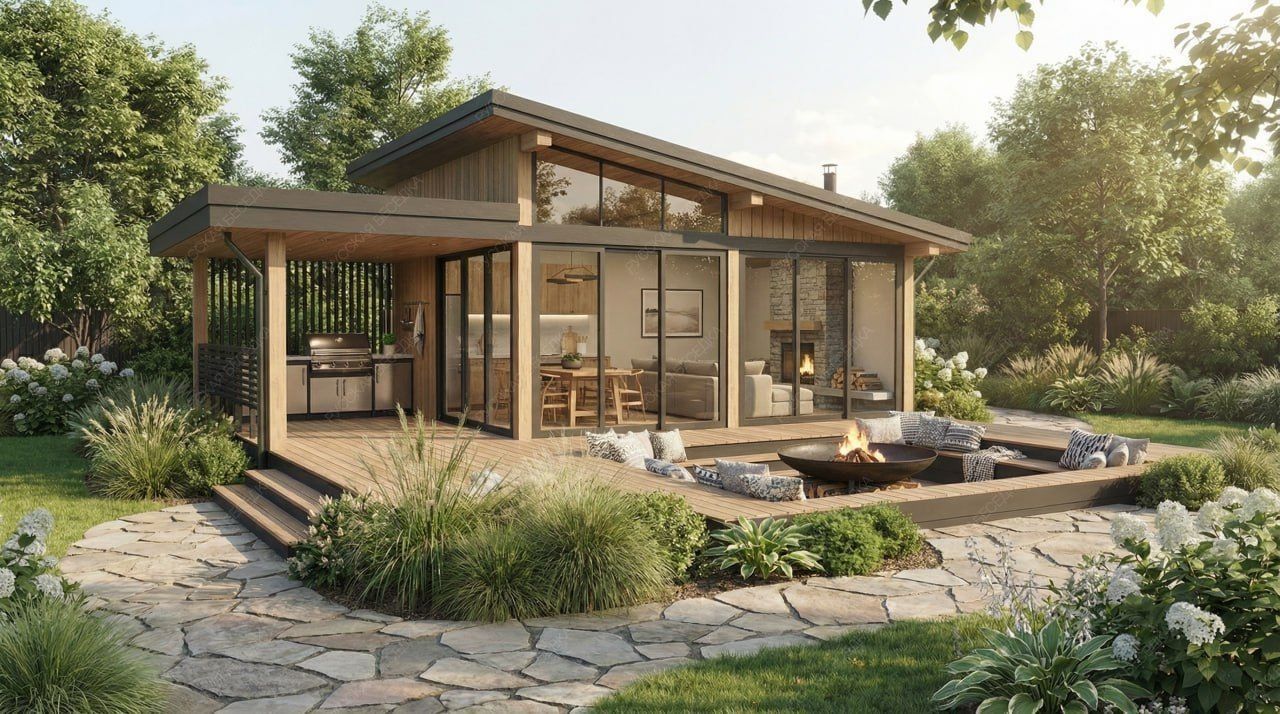 Отличительной особенностью зон отдыха является их многофункциональность: вы можете готовить на просторной веранде, организовать обеденную зону под навесом или в закрытой части, расположить летний кинотеатр под открытым небом, интегрировать в конструктив террасы бассейн или детскую площадку.